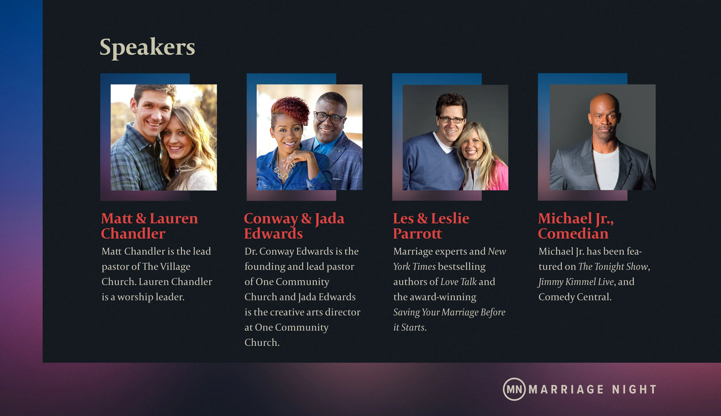 Marriage Night will bring together thousands of husbands, wives, and engaged couples to hear from Matt and Lauren Chandler (The Mingling of Souls), Conway and Jada Edwards (When Love’s in View), Les and Leslie Parrott (The Good Fight), and comedian Michael Jr.